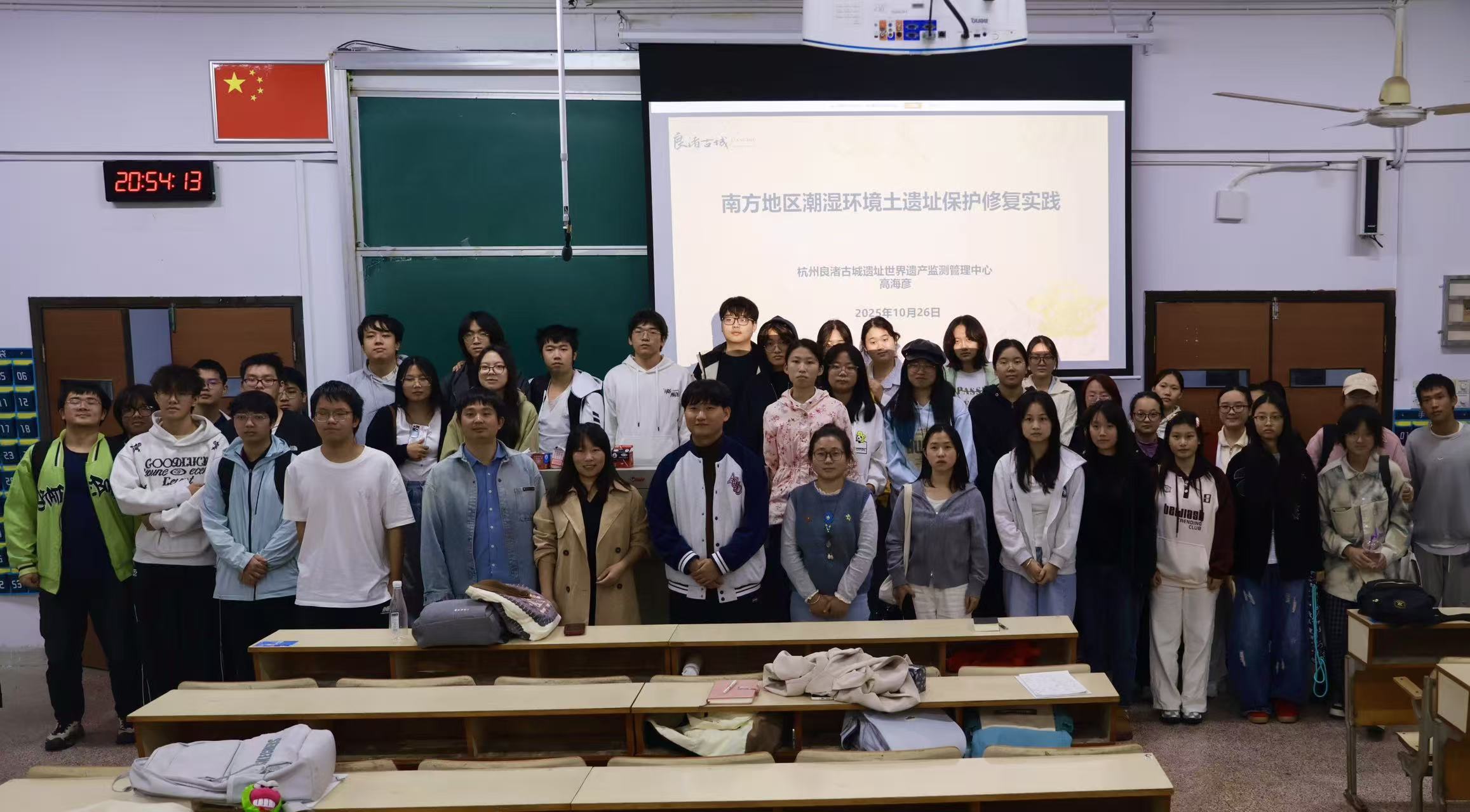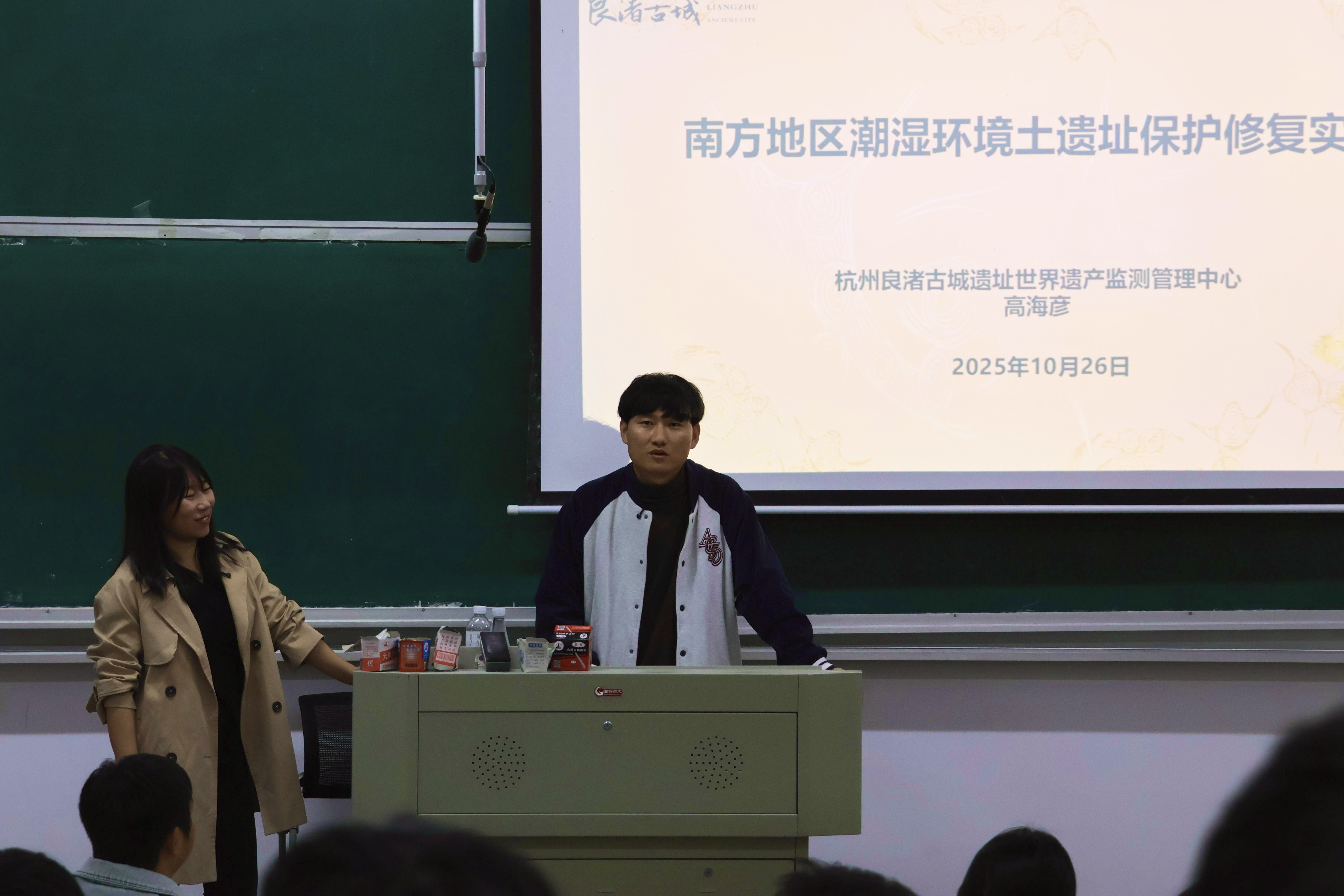 为进一步深化学生对不同类型文物保护修复理论与实践的全面理解,推动课堂教学与行业实践的深度融合,提升文博人才培养质量,促进高校与文博行业之间的产教融合、协同育人,2025年10月,我院《无机质文物保护》课程特邀黄山风景区博物馆章静茹、湖北省博物馆张济夏、杭州良渚古城遗址世界遗产监测管理中心高海彦,为2024级文物保护技术专业学生开展了“石质文物、陶瓷文物与土遗址保护修复实践”系列专题讲座,讲座由学院教师刘潮、魏强兵主持。