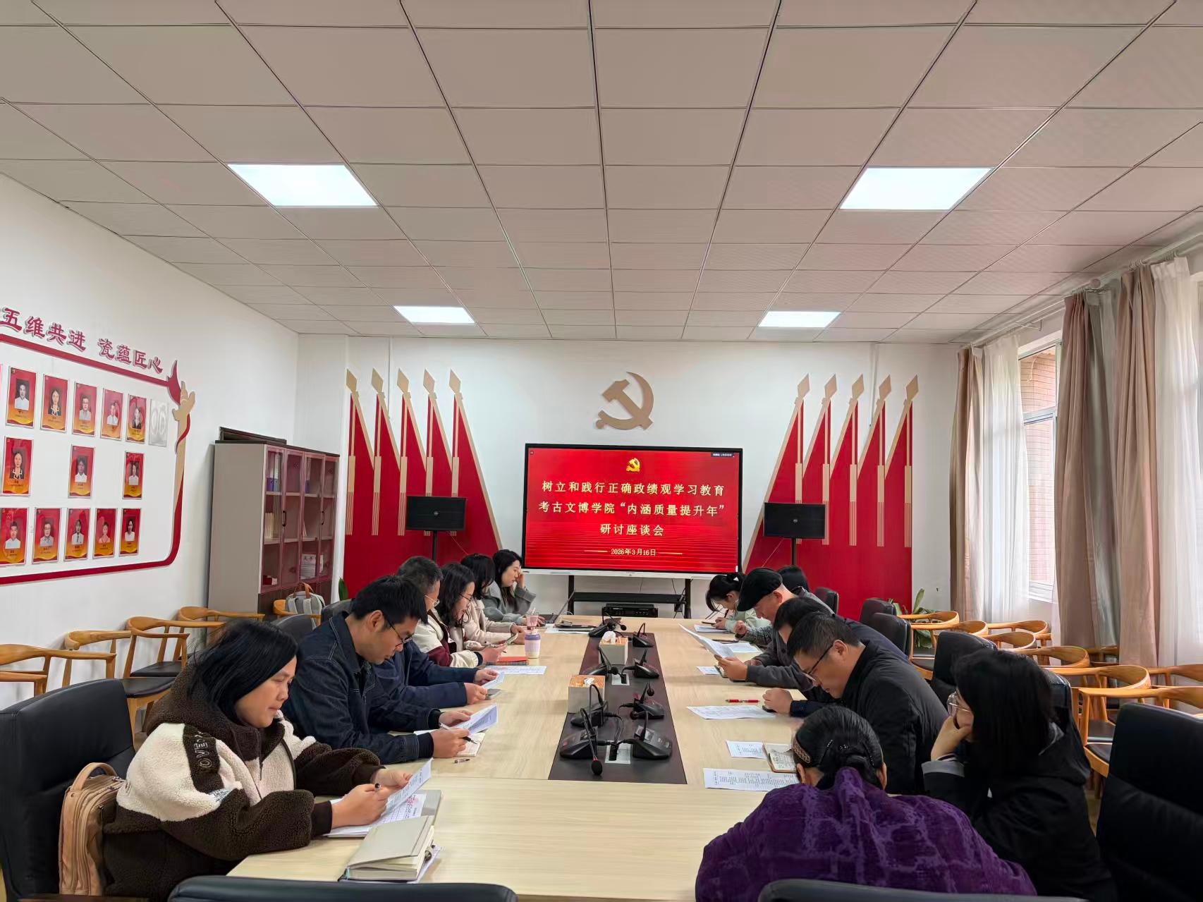 为深入贯彻落实新时代党的教育方针,进一步引导广大教职工树立和践行正确政绩观,推动学院高质量内涵式发展,近日,考古文博学院组织召开了树立和践行正确政绩观学习教育暨“内涵质量提升年”研讨座谈会。学院领导班子成员、全体科级干部、各系负责人及教师代表参加会议,会议由学院党委书记王建。