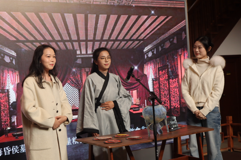 考古文博学院学生团队带来的《食语海昏》情景表演,将历史知识转化为鲜活的舞台叙事。同学们以海昏侯国的饮食文化为切入点,通过精心编排的场景与台词,生动演绎了汉代宴饮的礼仪与风尚,让沉睡于文献与文物中的历史“活”了起来,引发现场观众的浓厚兴趣。