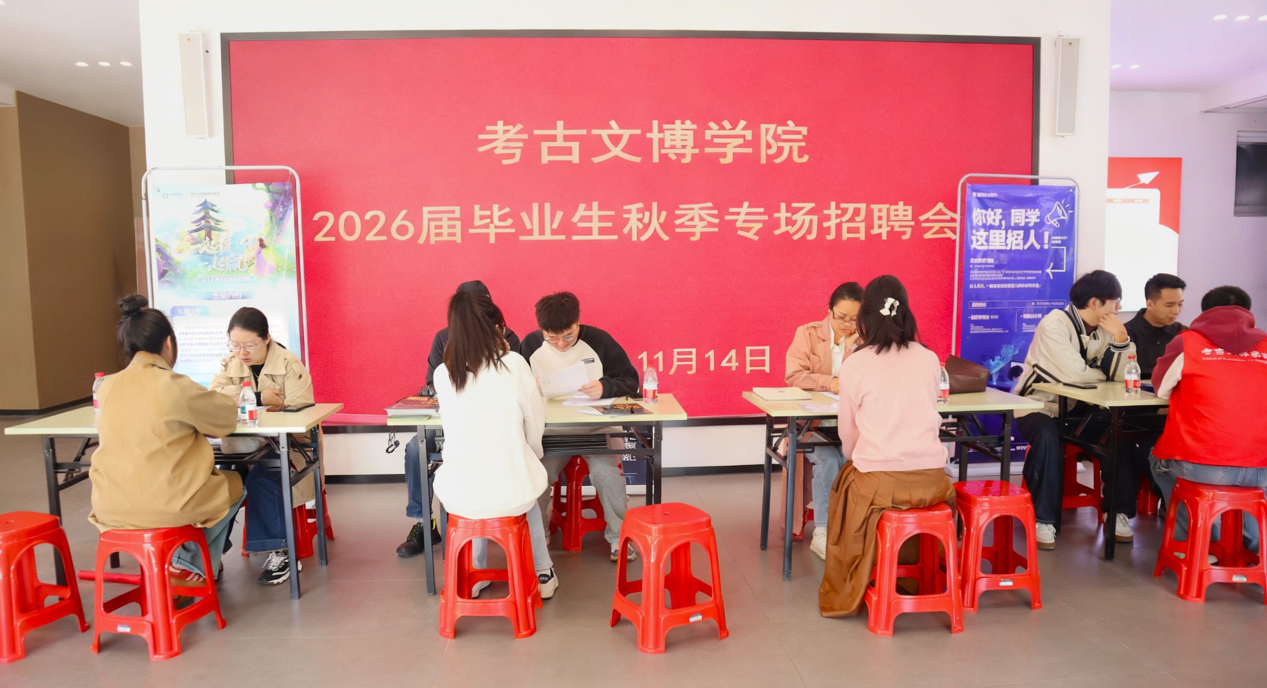 为切实推进2026届毕业生就业工作,搭建优质供需对接平台,11月14日,考古文博学院于新厂校区学院楼一楼大厅成功举办2026届毕业生秋季专场招聘会。校党委常委、副校长黄勇,院党委书记王建、院长陈宁、院党委副书记陈婷及学院辅导员到招聘会现场与用人单位和毕业生深入交流,了解企业招聘需求和学生求职意向,指导就业工作。
